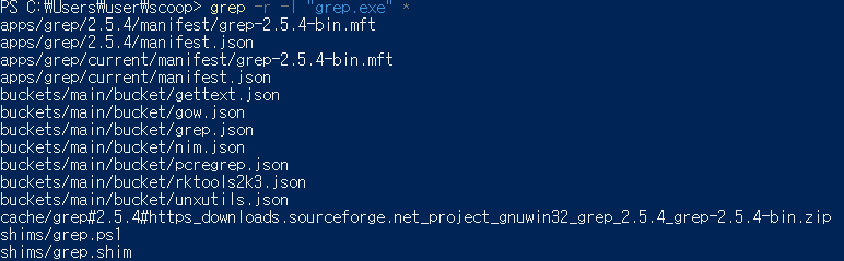 위의 그림은 설치한 grep도구를 윈도우에서 사용한 예제로 리눅스에서 사용하던 그대로 사용할 수 있다. 스쿱의 홈 디렉터리에서 전체 디렉터리에서 grep.exe 문자열을 가지고 있는 모든 파일을 찾은 것이다.