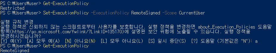 파워쉘의 수행 권한이 있어야 하는데 위의 그림처럼 "Set-ExecutionPolicy -ExecutionPolicy RemoteSigned -Scope CurrentUser" 명령으로 수행할 수 있다. 경고가 나오면 "A"로 "모두 예"를 선택하면 된다.