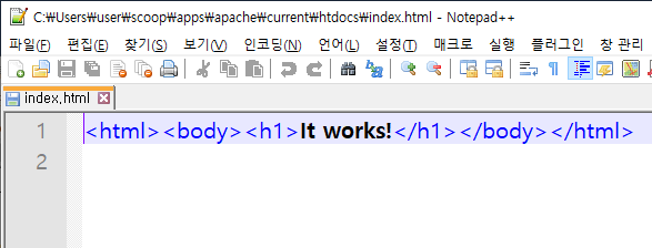 이 상태에서 웹브라우저의 주소창에 "http://localhost"라고 입력하면 좌측의 그림처럼 웹서버의 정상 동작을 확인할 수 있다. "It works!"라고 표시하는 것은 우측의 그림처럼 앞서 살펴본 웹문서 폴더의 index.html에서 표시하는 것이므로 이 파일을 시작으로 웹문서를 작성하면 된다. 파워쉘에서 Ctrl+C키를 입력하면 서버를 중단시킬 수 있다. 만약 아파치 웹서버를 백그라운드 서비스로 관리하려면 sudo 도구가 있어야 하는데 없으면 "scoop install sudo"로 설치한다. 웹서비스를 서비스로 등록하고 실행하려면 아래와 같은 명령을 입력한다. 이렇게 하면 컴퓨터가 부팅될 때 서비스를 자동적으로 수행시킨다.