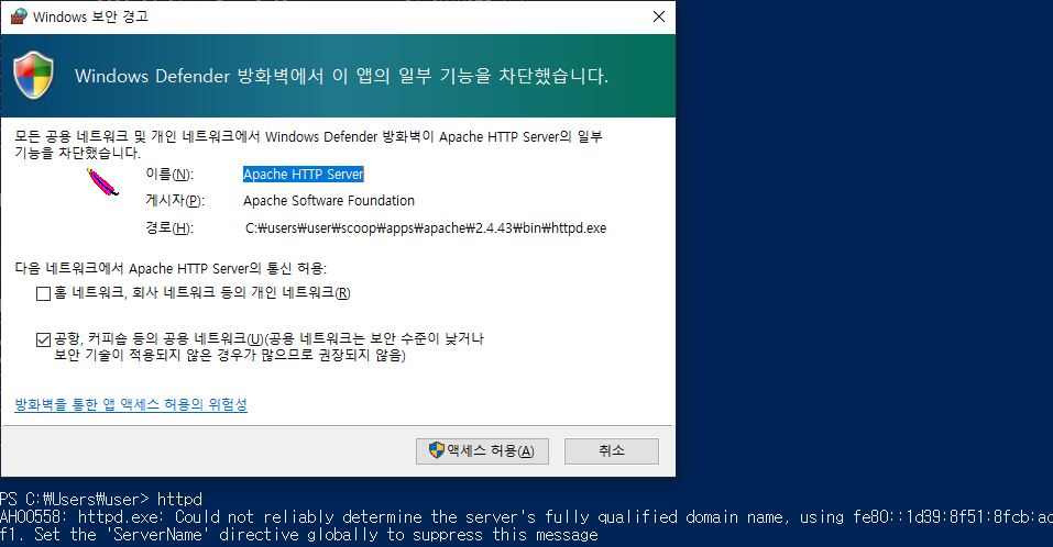 위의 그림처럼 파워쉘에서 httpd라고 입력하면 웹서버를 실행시킬 수 있는데, 이는 백그라운드 서버로 동작하는 것이 아니므로 프로그램이 끝날 때까지 파워쉘은 더 이상 진행되지 않는다. 서버를 동작시킬 때 보안 경고창이 나오는데 [액세스 허용]을 해주면 추후에는 메시지가 나오지 않을 것이다.