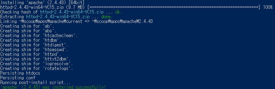 위의 그림처럼 "scoop install apache"라고 입력하면 아파치 웹서버를 간편하게 설치할 수 있다. 이 상태에서 바로 웹서버를 가동해 볼 수도 있겠지만 웹문서들을 어디에 복사할지는 알아야 하므로 웹문서 폴더와 웹서버 환경 파일의 폴더 위치는 확인해 두고 진행한다.