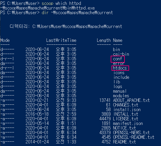 웹서버는 스쿱 설치 폴더 아래 위치하게 되는데 위의 그림 처럼 "scoop which httpd" 명령으로 웹서버의 홈 디렉토리를 확인할 수 있다. 홈 디렉터리인 "~/scoop/apps/apache/current"의 내용을 보면 환경 파일이 있는 conf 폴더와 웹문서 폴더인 htdocs를 확인할 수 있는데 다양한 웹설정을 바꾸려면 conf/httpd.conf 파일을 텍스트 편집기로 수정하면 되고 웹문서들은 htdocs 폴더에 복사하면 된다.