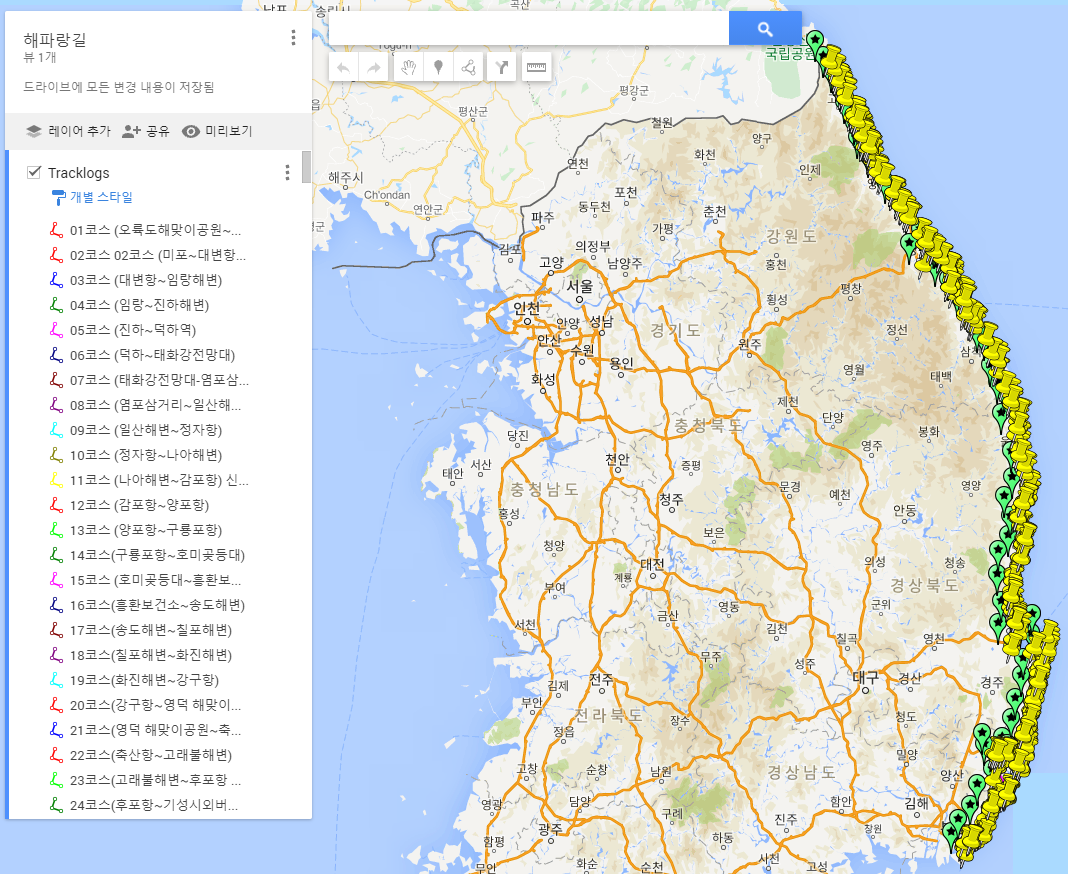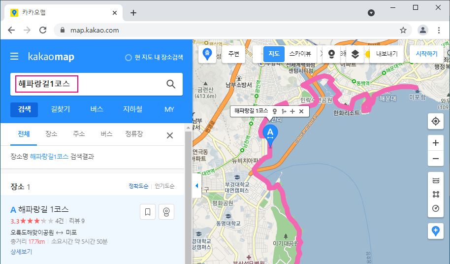 끝으로 포털 지도를 활용하는 것이 도움이 된다. 구글 지도나 맵스닷미 보다는 정밀도에 있어서는 국내 업체들의 지도가 좋지요. 카카오맵 검색창에서 "해파랑길1코스"의 형식으로 코스 번호를 입력하여 검색하면 위의 그림처럼 코스 경로를 아주 자세하게 확인할 수 있다.