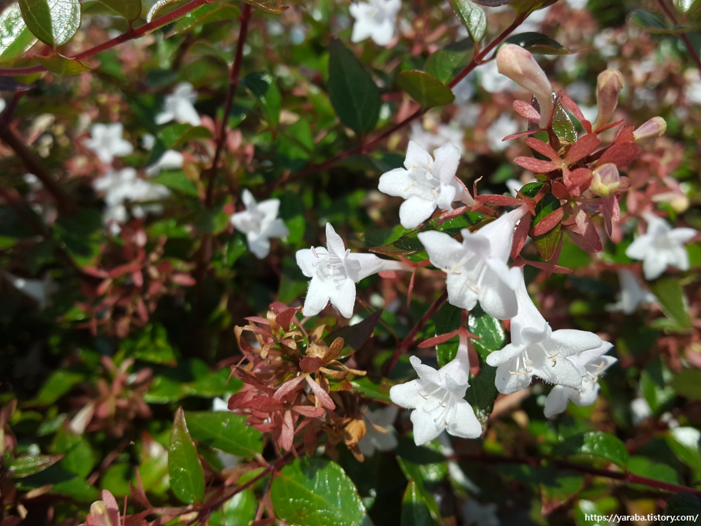 댕강 나무라는 나무의 이름이 독특한데 그 유래는 꽃과 새 가지의 밑 부분이 댕강 댕강 잘 부러져서 붙은 이름이라고도 하고 가지를 꺾을 때 댕강 댕강 소리가 나서 붙은 이름이라고도 한다. 꽃말이 "평온함" 이라는데 평화로운 걷기가 되라는 축복 같기도 하다.