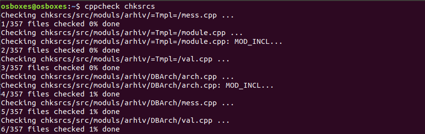 가장 쉬운 사용법은 "cppcheck 폴더 이름"을 입력하는 것으로 위의 그림처럼 폴더 내의 코드들을 찾아서 분석을 시작한다. 결과는 화면으로 나오므로 저장하거나 나름의 방법을 사용하는 것이 좋다.