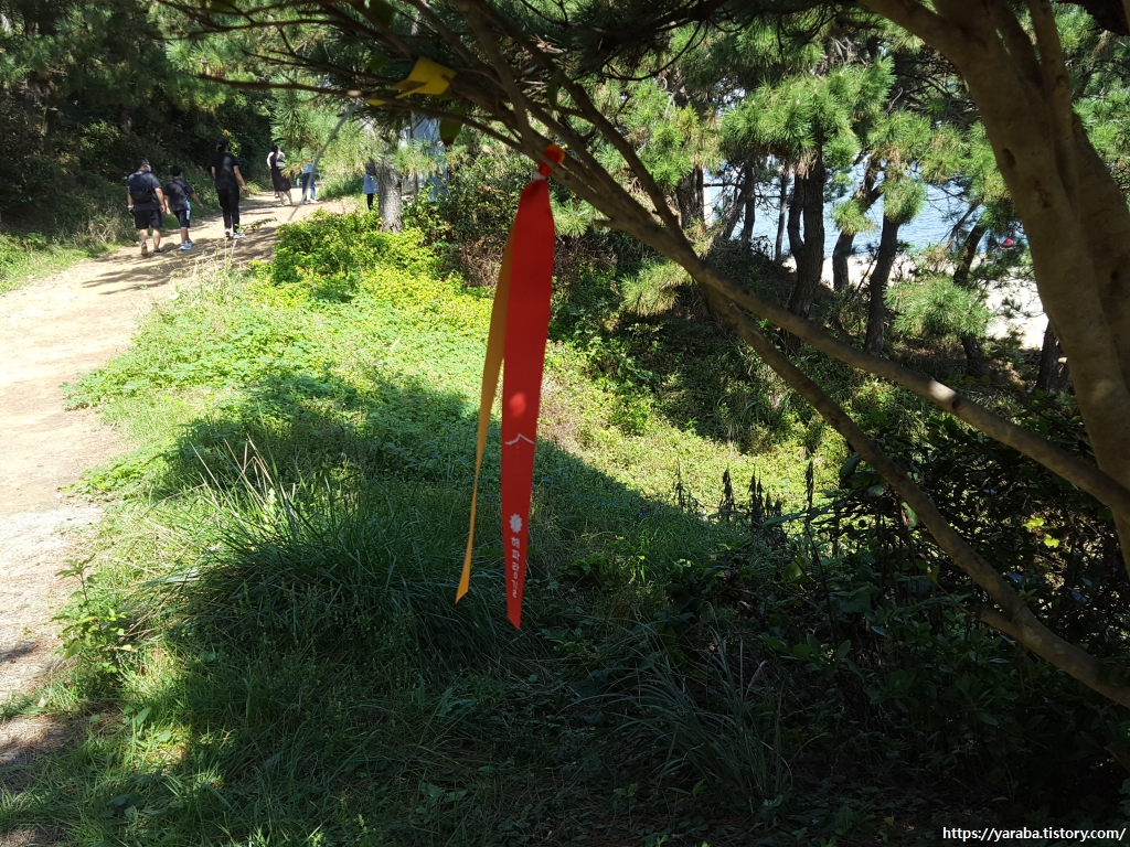 길을 찾을 때 자주 찾게 되는 해파랑길 리본. 빨간색과 주황색으로 구성한 리본이다. 숲길에서도 마을길에서도 헷갈리다 싶은 곳이면 하나씩 매달려 있다.
