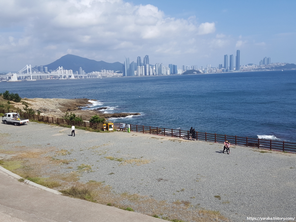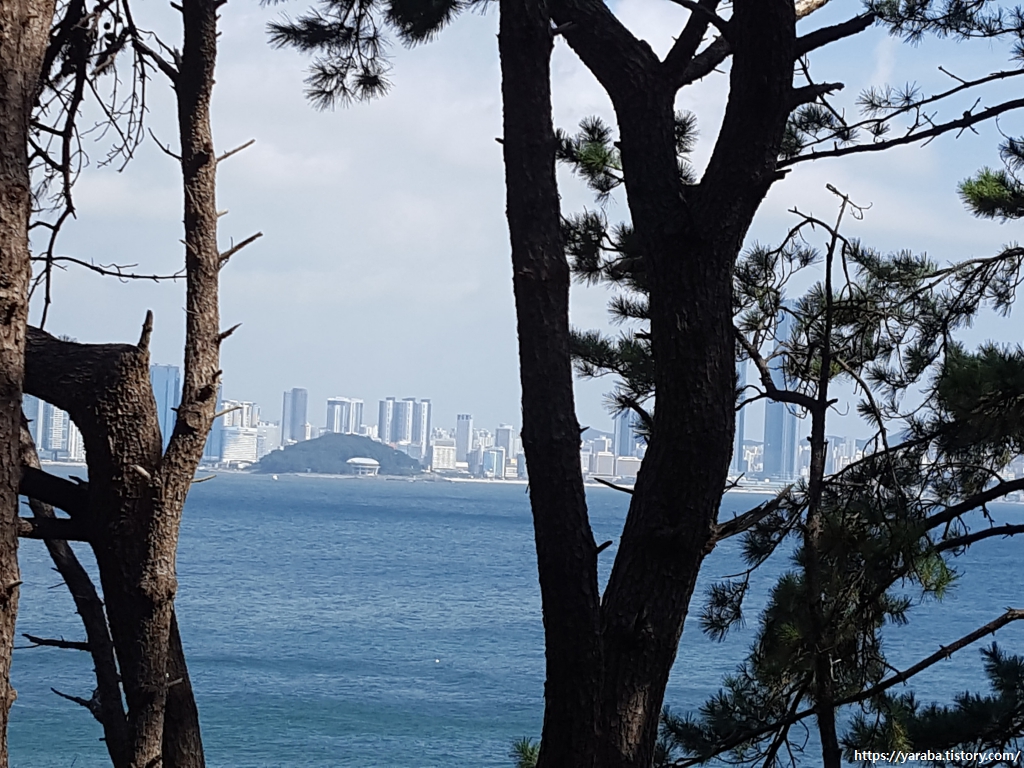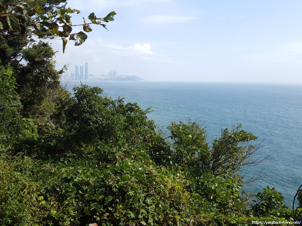 멀리 오늘의 목적지인 미포항이 보인다. 사실 미포항이 보이는 것이 아니라 바로 옆에 있는 101층짜리 엘시티가 보이는 것이다. 직선거리로 치면 7Km 정도이니 2시간이면 충분하겠지만 느림보 걸음으로 해지기 전에 도착이나 할 수 있을까 모르겠다.