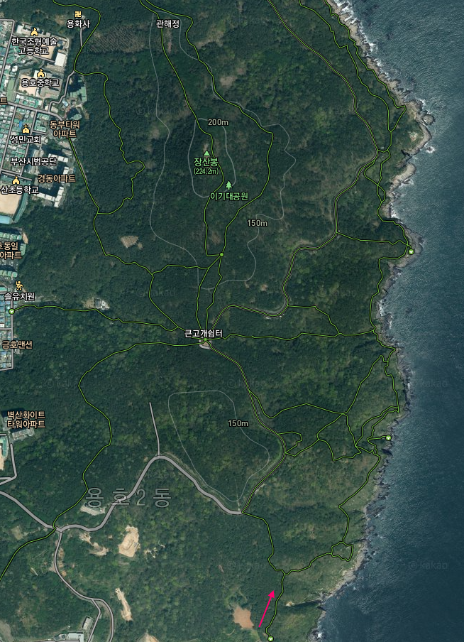 지도에서 보듯 바다를 따라가는 해안 산책로는 장산봉 줄기가 용호동 시가지를 벽으로 막고 있고 수많은 갈래의 산책길들이 이리저리로 이어져 있다. 때마침 대체휴일이라 산책하는 사람이 많았는데 대부분 이 근처에 사는 사람들로 보였다. 무거운 배낭을 메고 높지 않지만 산길을 걷는 사람은 거의 우리가 유일했다. 산책로로 이어지는 수많은 길이 있으니 목적지는 알 수 없지만 같은 방향으로 혹은 반대 방향으로 아침 먹고 운동하러 나온 사람들을 계속 만나야 했다.