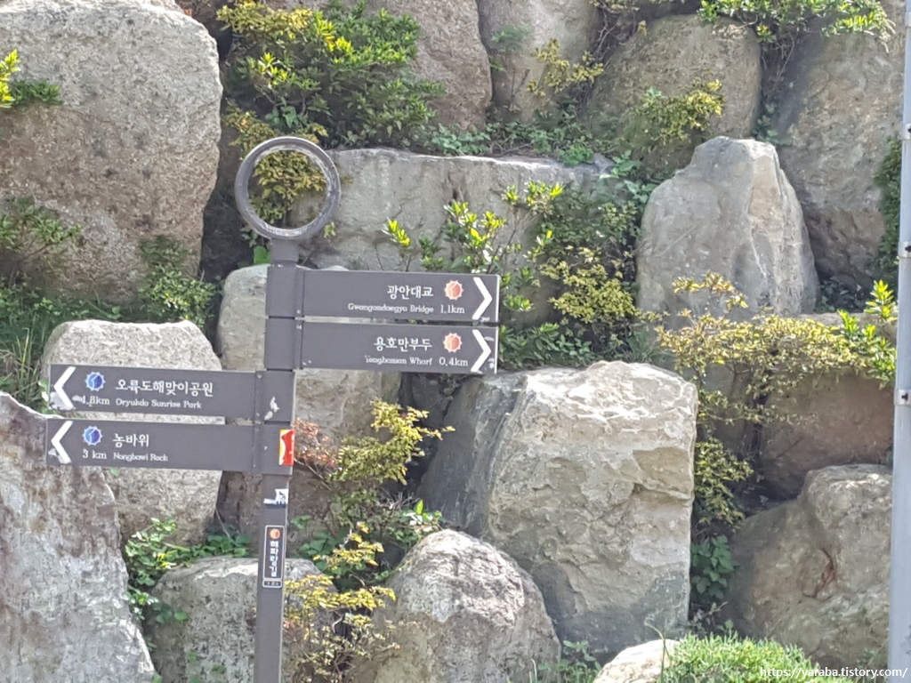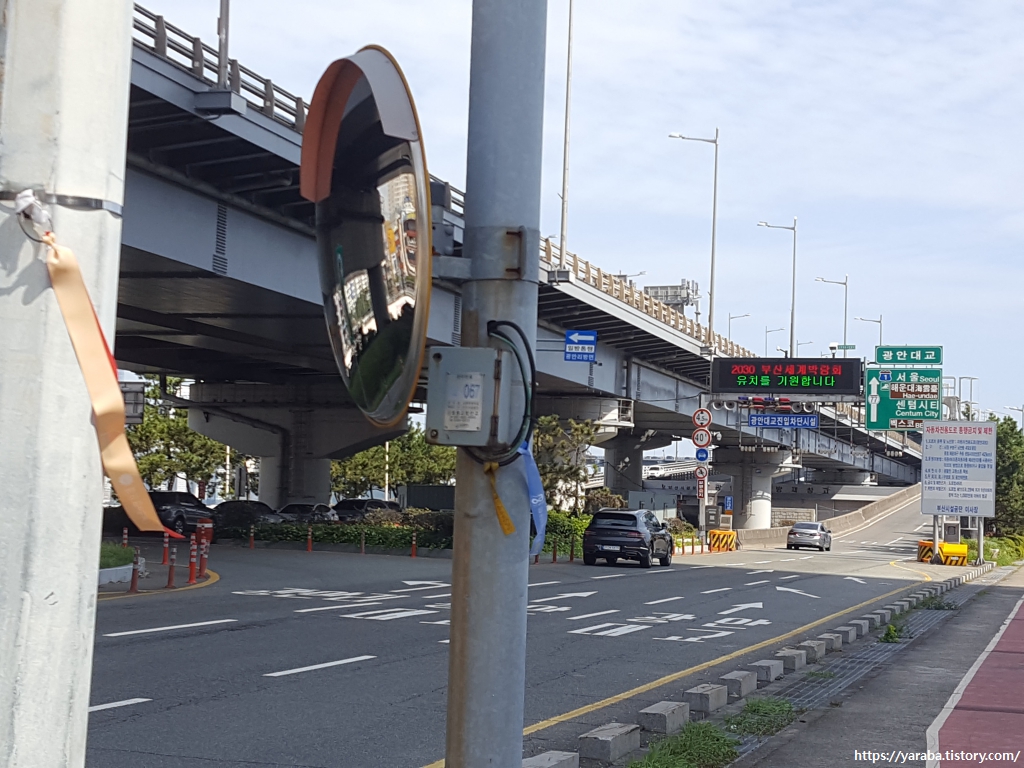 광안대교 아래를 지나야 하는데 분포교를 건너서 우측으로 조금 꺾어져 횡단보도를 건너면 된다. 광안대교 진입로에 적힌 "서울" 표지판을 보니 만감이 교차한다.