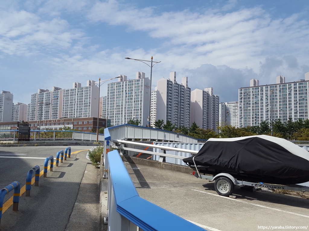 용호만 매립 부두 앞으로는 깔끔한 산책로가 이어진다. 도시안의 아파트 산책길이다.