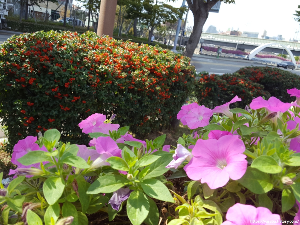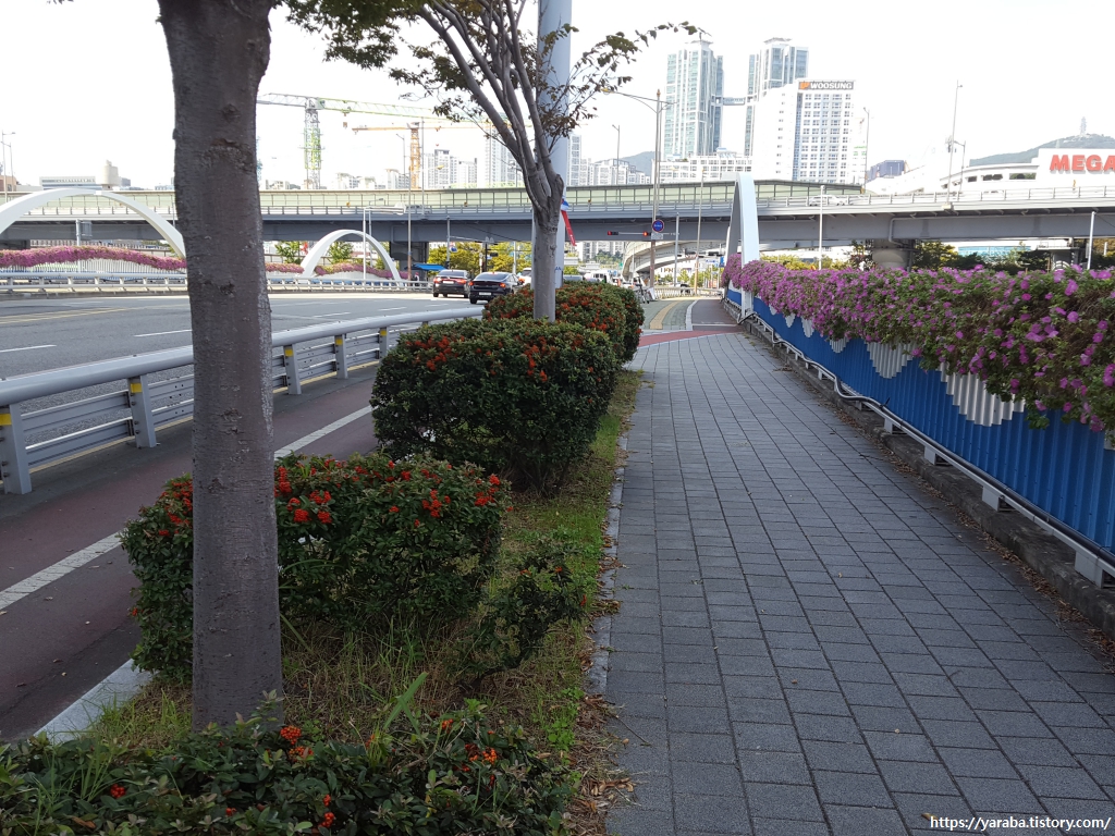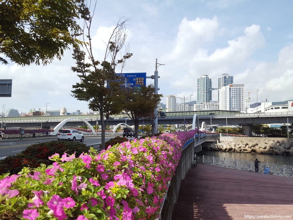 분포교를 지나 광안대교 아래로 향한다. 부산은 다리마다 꽃을 심어 놓았다. 이 꽃은 피튜니아라는 꽃인데 봄부터 가을까지 계속 꽃을 피우고 생명력도 강해서 키우기 어렵지 않다고 한다. 교각 위 화분에 딱 맞는 품종을 잘 선택했구나 하는 생각이 든다.