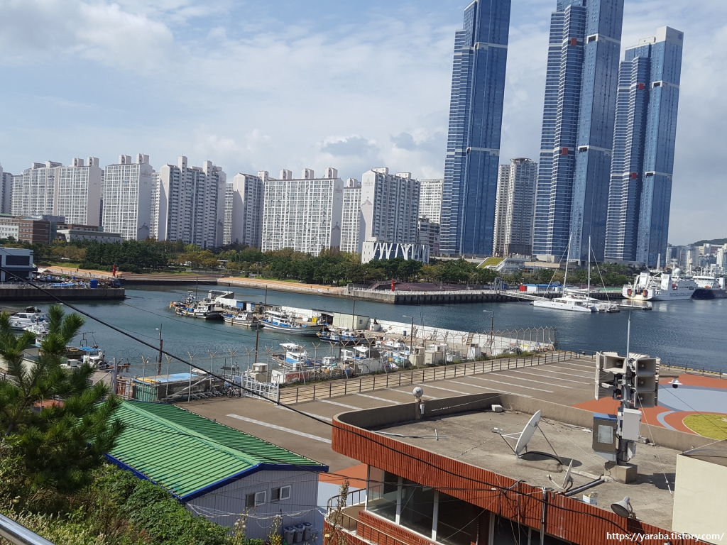 이기대를 뒤로하고 계속 걸으면서 횟집이 여러 군데인데 이곳에서 쉬면서 점심을 먹으면 어떨까? 하는 고민이 많았었다. 횟집 밖에 주인장과 연예인이 함께 찍은 사진들을 보며 "우리 들어갈까?" 했지만, 아침에 든든하게 먹은 돼지국밥 때문일까 옆지기는 좀 더 걷자고 한다. 언덕에서 바라보니 우리가 조금 있으면 만나게 용호만 매립 부두가 보인다. 이곳이 육지가 된 것은 1960년대로 거슬러 올라간다. 포항제철이 모래밭을 매립하여 세워진 것처럼 이곳은 동국제강이 공장 부지로 매립을 시작했다고 한다. 그러다가, 주택가가 확장되면서 제철소는 1990년대까지 다른 곳으로 이전했고, 소유주는 건설사로 넘어갔다고 한다. 지금은 고층 아파트와 마천루들로 옛날의 모습은 상상할 수가 없다.