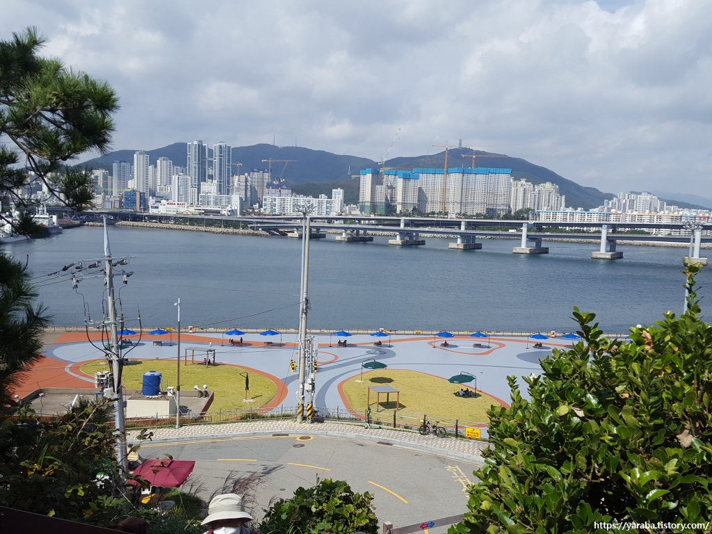 트레일 길을 나오면 이제는 포장된 길에 접어든다. 바로 앞에 보이는 곳이 용호 별빛 공원이라는 장소이고 바다 건너편으로 광안대교의 시작점이 보인다. "별빛 공원"이라는 공식 명칭이 붙은 것은 2021년 7월이니 얼마 되지 않았다.