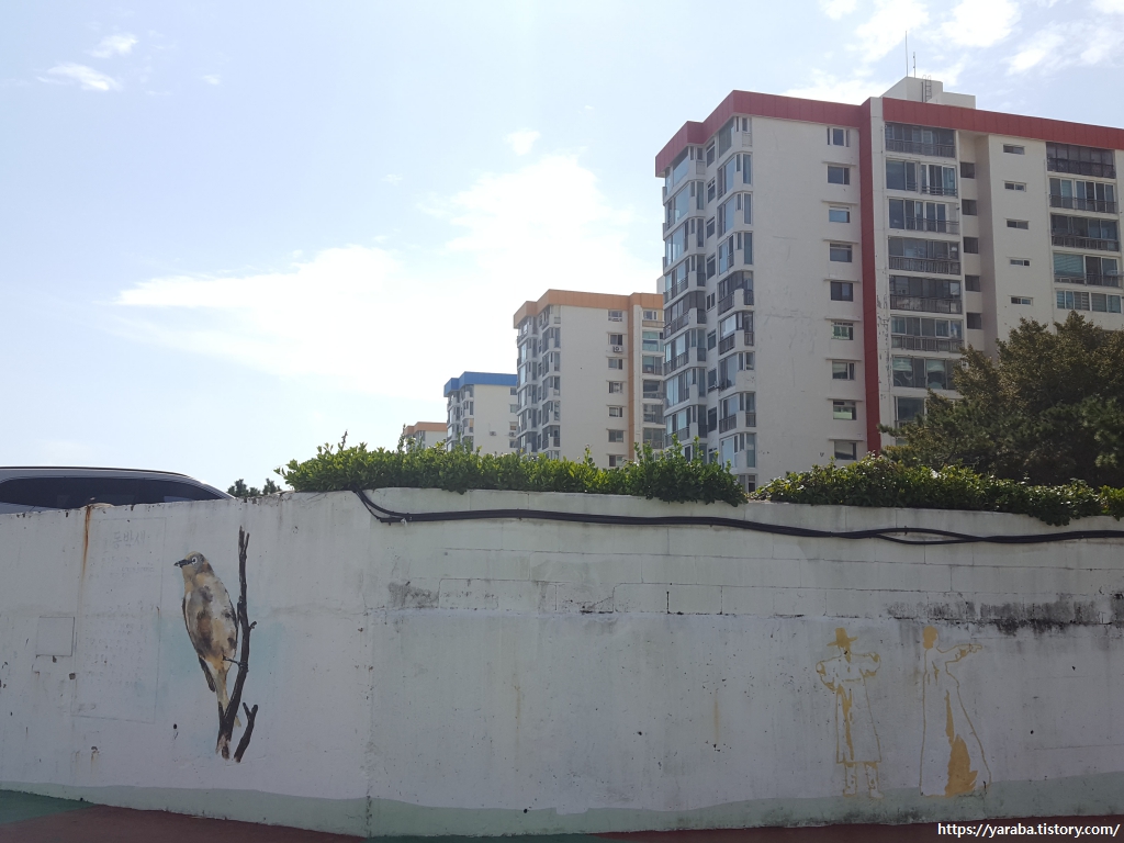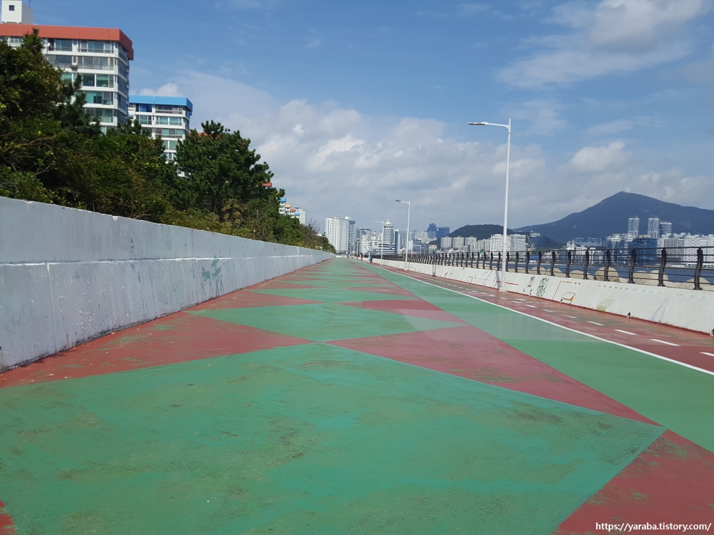 해파랑길은 부산에서 재건축으로 핫하다는 삼익비치 아파트 앞쪽을 지난다. 사진에서 보듯이 스케이트 보드, 자전거등 가벼운 운동을 하기에 좋은 널찍한 공간이었다. 아파트가 재건축되어도 이 공간이 유지될 수 있을지 모르겠지만 한낮의 강한 햇빛을 피할 곳이 없다는 점만 빼면 이곳 주민들에게는 없어서는 안 될 공간이지 않을까 싶다.