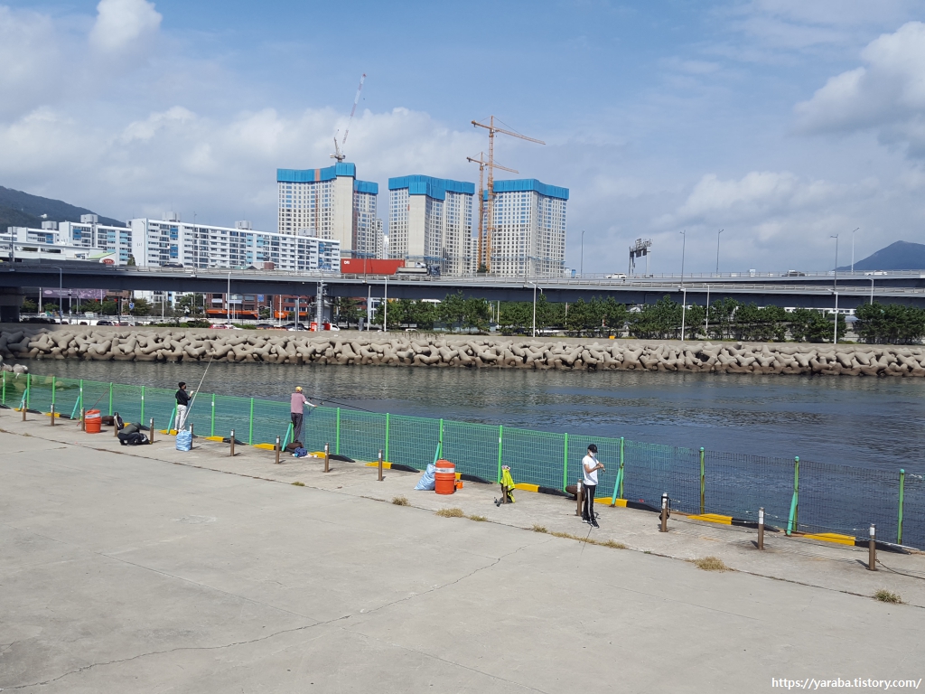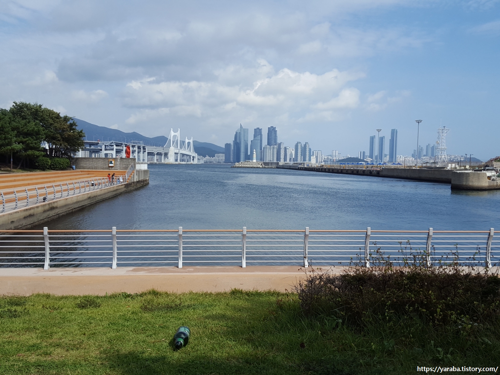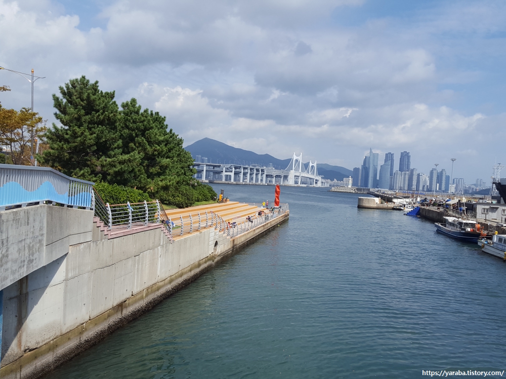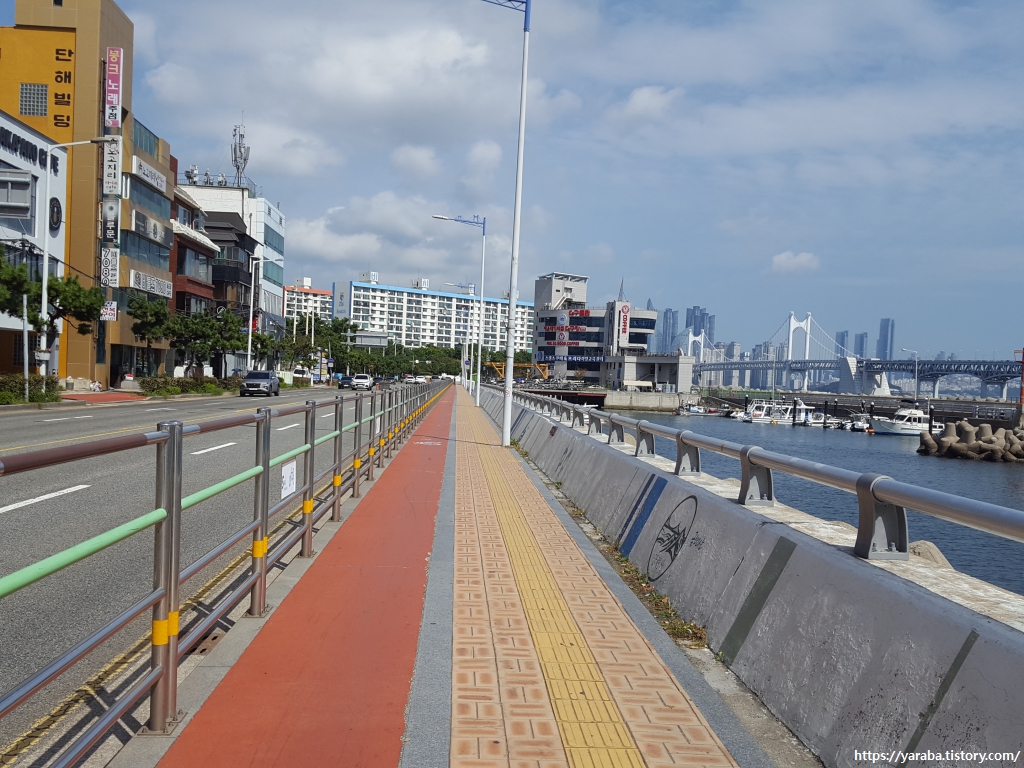 길은 용호만 매립 부두와 광안 대교를 향하여 이어진다. 동산교라는 작은 다리를 건너는데 다리 아래로 흐르는 수로는 근처 부산 남구의 하수처리장과 바다를 잇는다.