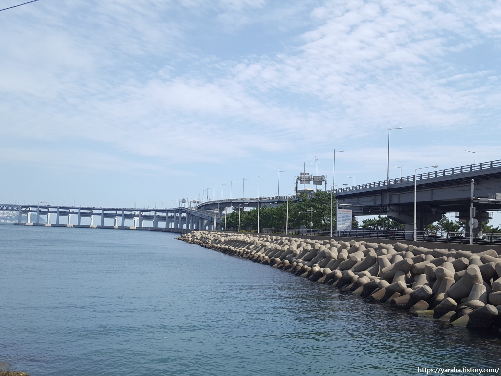 광안대교 아래를 지나서 바라본 광안대교의 모습이다. 트라이포트로 채워진 해안가, 바다를 가로지르는 콘크리트 다리를 보며 자본과 사람이 만들어낸 결과물에 대한 이런저런 생각이 머리를 지나간다.