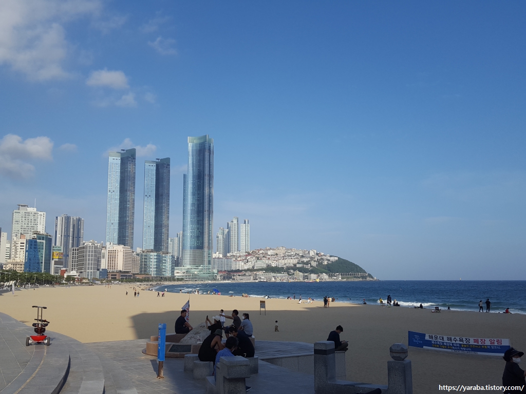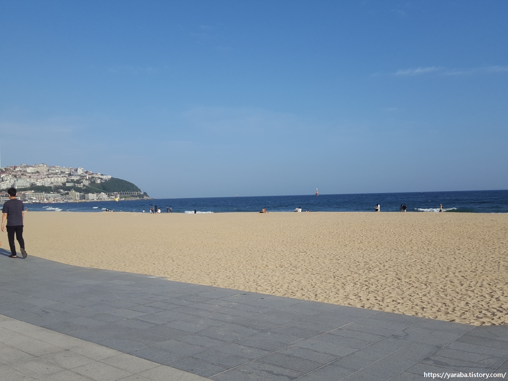 해운대 해수욕장에 올 때면 늦어서 캄캄하거나, 항상 어딘가 공사 중이었는데, 이번에는 온전한 모습의 해수욕장을 만난다. 깨끗하고 깔끔했다. 우리나라에서도 세계적으로도 유명한 해수욕장을 해파랑길을 걷는 이제야 온전히 보게 된 것이다. 1.5Km에 이르는 해수욕장의 길이가 짧다면 짧지만 15Km가 넘는 거리를 걸은 이후라서 그런지 중간에 쉬어가야 했다. 쉬면서 지나는 사람들을 "멍" 때리며 바라보는 시간도 나름 재미있었다. 구릿빛 몸매를 뽐내며 운동하는 사람들, 인증숏 찍기에 여념 없는 커플들, 아이들 쫓아다니느라 온 정신을 쏟는 사람들......