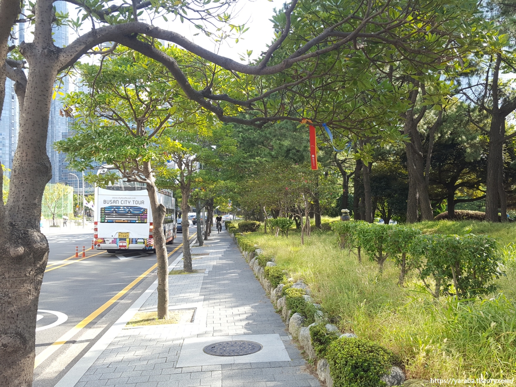 요트 경기장 옆의 출입문으로 나오면 이제 마린시티를 향해서 걷는다. 나뭇가지에 매달린 해파랑길 리본을 확인하며 길을 잘 찾아 왔구나 하는 마음으로 길을 이어간다. 사진을 보면 부산 시티 투어 버스가 지나고 있는데 레드, 블루, 그린 라인 세 코스가 있는데 이중에 레드 라인이 해파랑길 1코스와 상당 부분 같이 간다. 용호만 유람선 터미널 - 광안리 해수욕장 - 아르피나 - 요트 경기장 - 마린시티 - 동백섬 - 해운대 해수욕장에 이르는 코스이니 저 버스에 훌쩍 올라타고 천근만근 몸뚱이를 쉬게 해 주면 좋으련만 하는 부질없는 바람을 품어 본다.