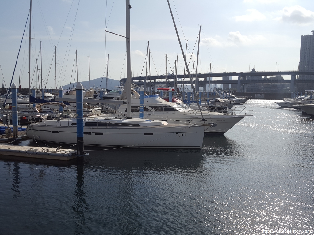 요트 경기장을 횡으로 가로질러 가는데, 전면의 마린시티를 보면서 걷는 느낌이 요트와 마천루가 언뜻 어울리는 풍경이 아닌가 싶다. 두바이와 아부다비에서 만났던 마천루와 요트의 조합이었다. "요트"도 "마천루"도 모두 "부"한 느낌, 럭셔리한 느낌이기 때문이 아닐까? 요트 경기장이라 하면 요트 경기를 위한 특별한 시설이 있을 것 같지만 실상은 고급 요트들의 주차장이라 할 수 있는 계류장이 그 대부분이다. 요트라 하면 돛을 달고 맞바람에도 지그재그로 바람을 거슬러 올라가거나 바람을 타고 날듯이 바다 위를 미끄러지는 운동 경기적인 시각으로 볼 수도 있겠지만 이곳에 정박된 요트들은 대부분은 모터가 달린 크루즈 요트나 낚시용 요트로 보였다.
