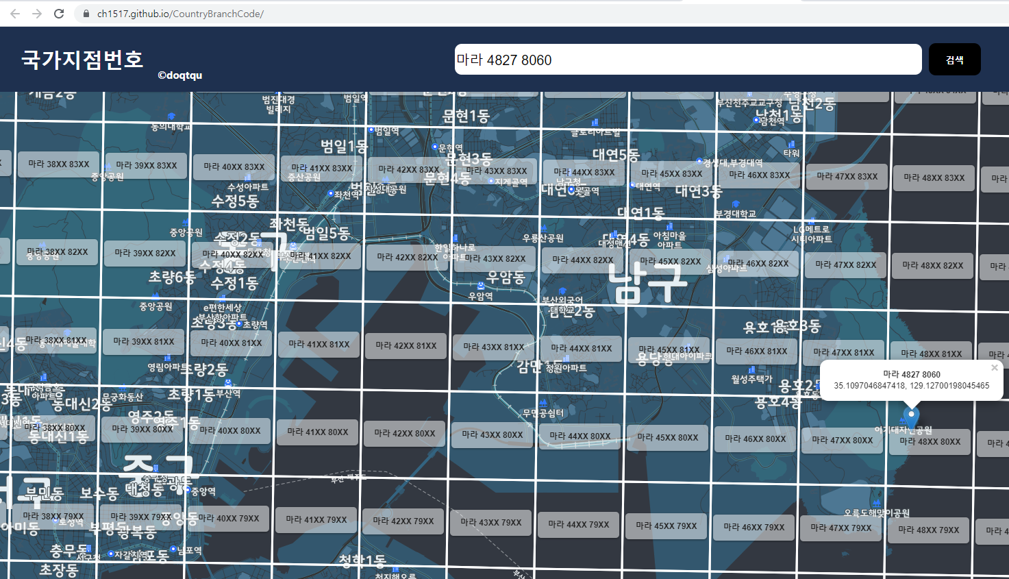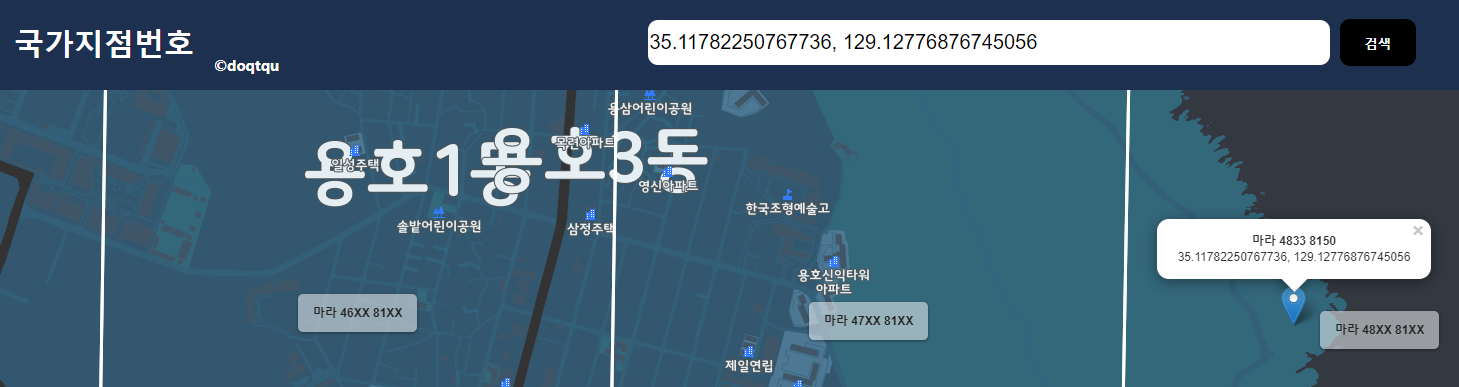 검색 창에서 두자리 한글, 공백, 네 자리 숫자, 공백, 네 자리 숫자 형식으로 입력하고 [검색]하면 위의 그림처럼 구글 지도를 배경으로 해당 위치가 어디인지를 알려준다. 또한 찾은 위치를 마우스로 클릭하면 말풍선으로 GPS 좌표도 확인할 수 있다.