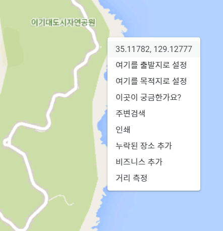 국내 포털 맵에서는 GPS 좌표를 알기가 쉽지 않고 구글맵을 활용하면 아주 간단한데, 구글맵(https://map.google.com)을 열고 원하는 위치를 우측 마우스로 클릭하면 위의 그림처럼 컨텍스트 메뉴가 나오는데 이때 상단에 있는 좌표를 클릭하면 좌표 값을 클립보드로 간단히 복사할 수 있다.