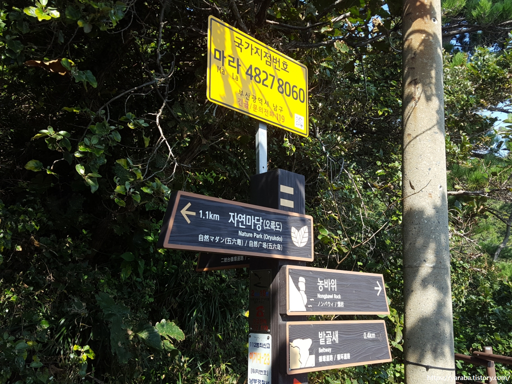 우리 동네도 그렇고, 요즘 걷기 여행을 하다 보면 자주 만나는 것이 사진과 같은 국가 지점 번호라는 표지판이다. 한글 두 자리와 숫자 8자리로 이루어진 위치 정보인데 위도와 경도로 나타내는 GPS 좌표라면 간단하기는 하겠지만 지구를 원형으로 하여 위도와 경도로 좌표를 나타내는 방식은 우리나라 공공기관에서는 사용하지 않는다고 한다. 지구를 평면 형태로 하여 좌표를 표시하는 방식을 사용하는데 한반도를 이어도에서 남서쪽으로 약 95km가량 떨어진 지점을 기준점, 즉 "가가 0000 0000"으로 하여 동쪽 및 북쪽으로 100km의 정사각형으로 된 격자 모양으로 나누고 가부터 차례로 기호를 붙인 것을 UTM-K라는 한국형 UTM 좌표계라 하고 이것을 국가 지점 번호라고 지칭한다고 한다. 10미터의 정밀도를 가지며 앞의 숫자는 기준점으로부터 동쪽으로의 거리, 뒤의 숫자는 북쪽으로의 거리를 나타내는데 거리의 뒷부분 네 자리를 의미한다.