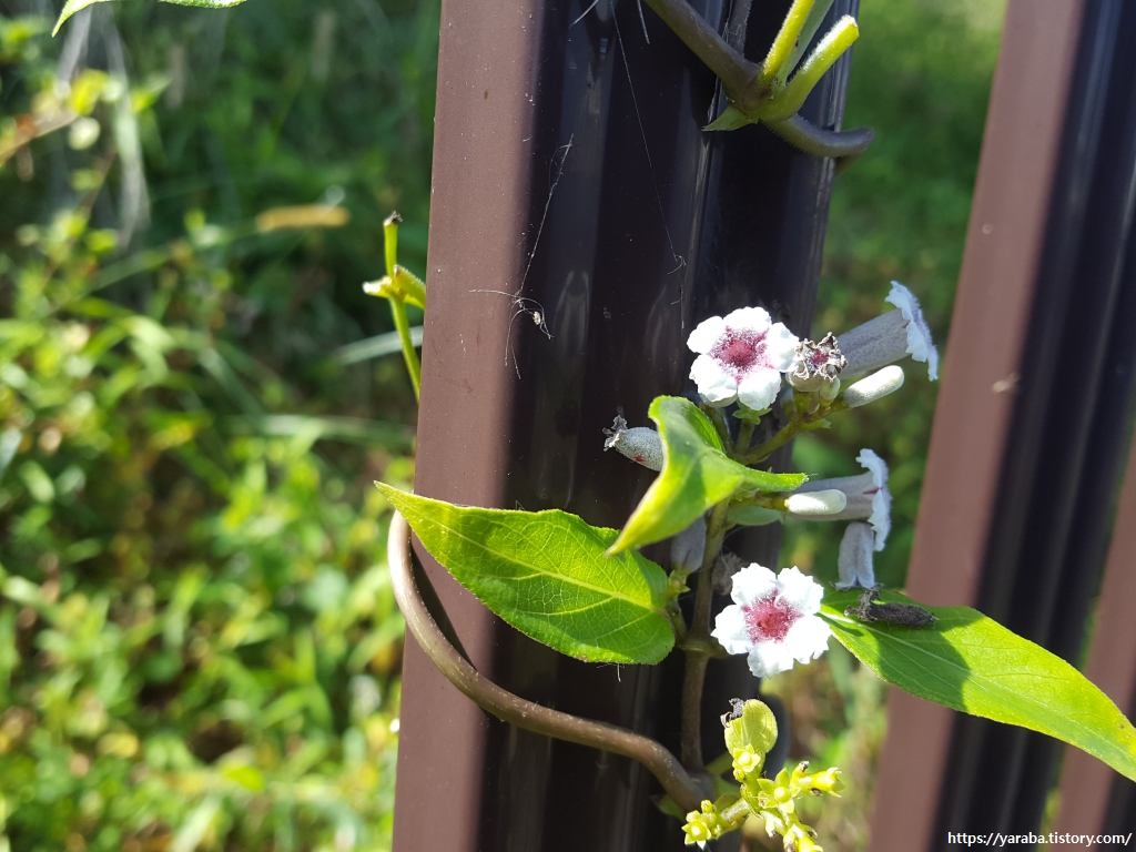 이름을 찾기가 어려웠는데 계요등(鷄尿藤)이란 식물로 보인다. 닭의 오줌 냄새가 난다고 붙은 이름이라고 한다. 식물 분류로 보면 더 재미있는데 계요등의 식물 분류가 꼭두서니과에 속한다. 꼭두서니는 우리나라에서 붉은 물을 들일 때 쓴다고 해서 붙은 이름이라고 한다. 뿌리를 사용한다. 꼭두 색이 옛말로 붉은색이었다고 한다.