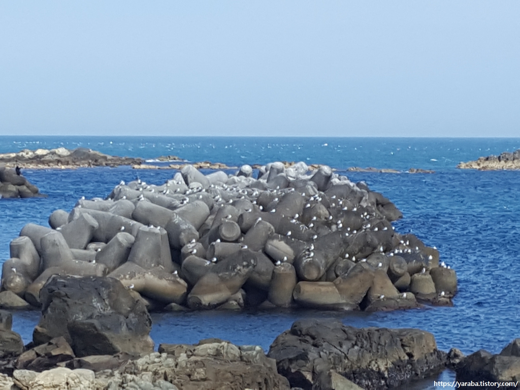 수산 과학원 앞바다 트라이포트 더미 위에서 휴식을 취하고 있는 새들. 태양광 패널도, 트라이포트도 인간의 의도와 새들의 자연스러운 본능과는 아무런 관련이 없어 보인다.