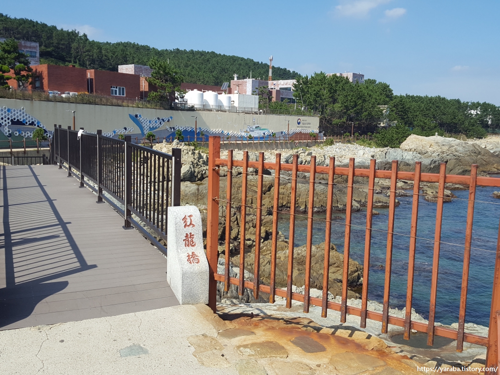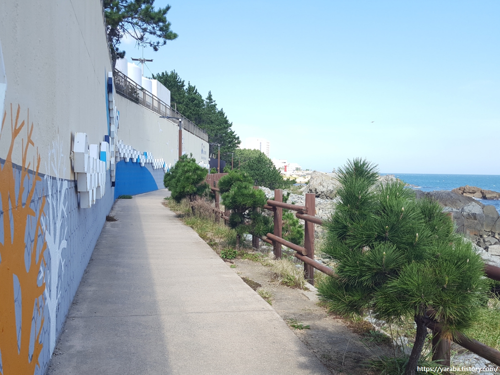 해동 용궁사의 해변 산책길은 국립 수산 과학원 외부 벽을 따라서 해안가로 이어진다.