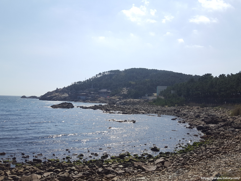 국립 수산 과학원 담장을 따라 걷다가 뒤를 돌아본 모습. 바위 해안 너머로 해동 용궁사가 멀리 보인다.