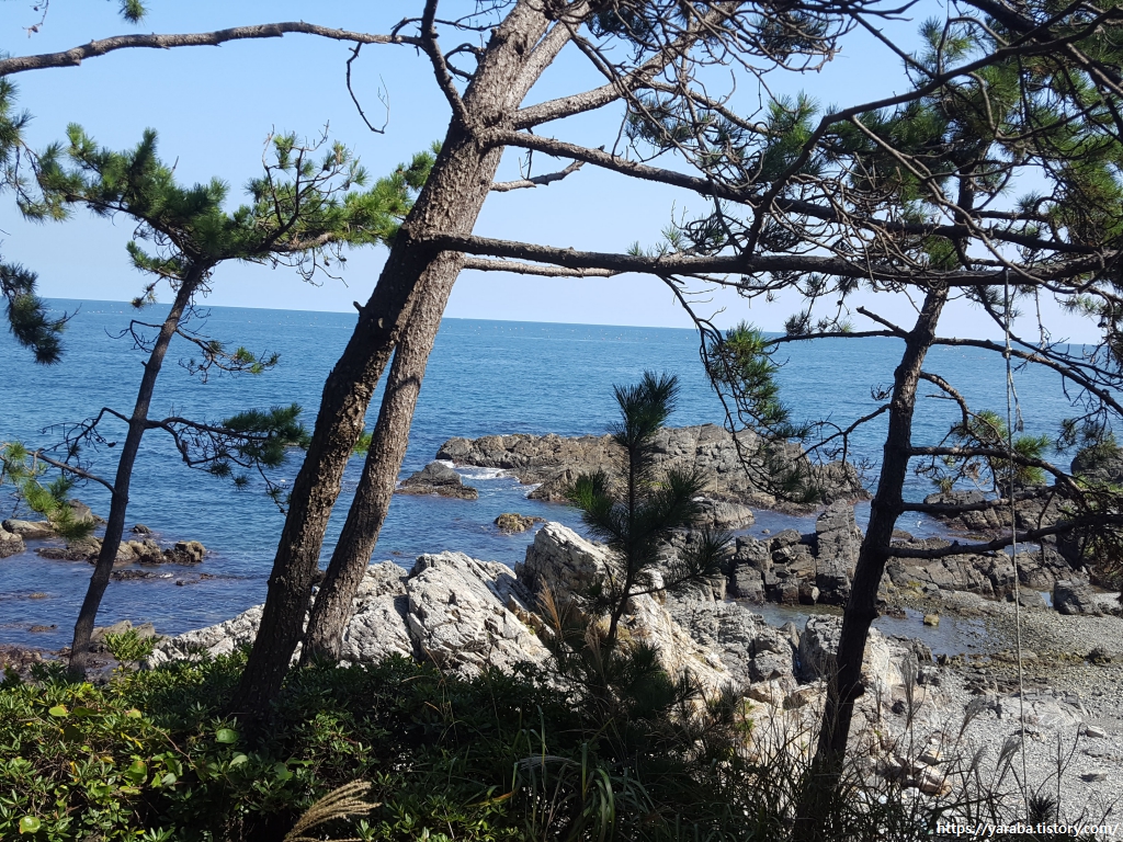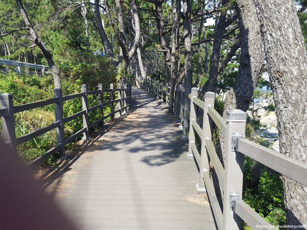 선바위 유원지 옆으로는 차로 변이 아니라 소나무 사이로 조성된 산책길을 걷는다. 차로가 멀지 않아 차 소리가 들리기는 하지만 소나무 사이 산책길을 걸으며 바다를 보는 풍경도 좋다.
