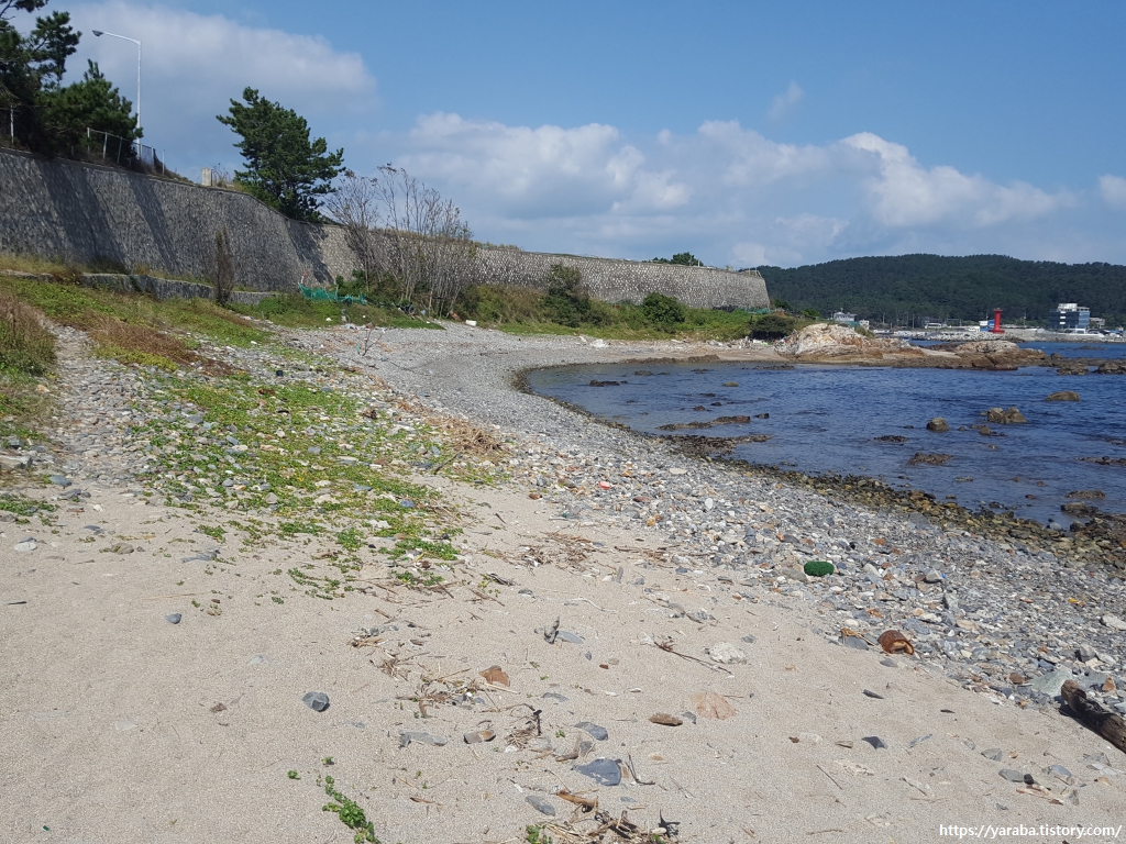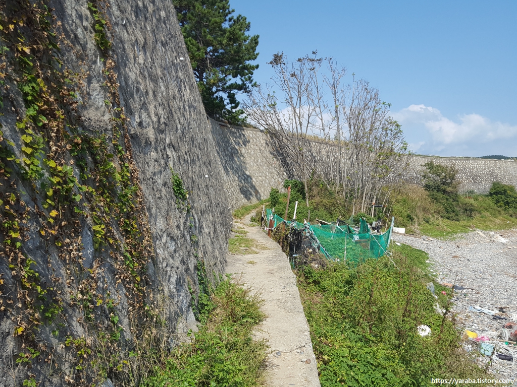 샛길 끝에 이르면 방파제를 만나고 이제부터는 한국유리 부지 담장을 따라서 해안가를 걷는다.
