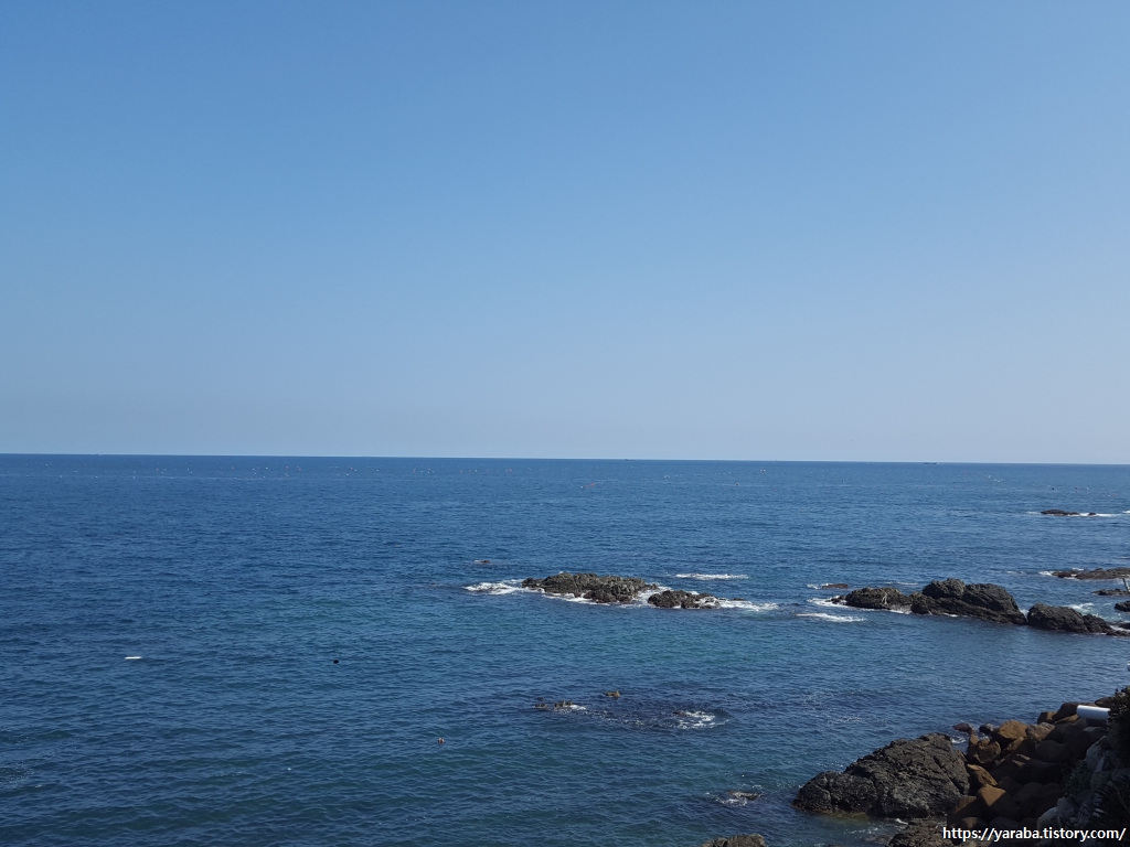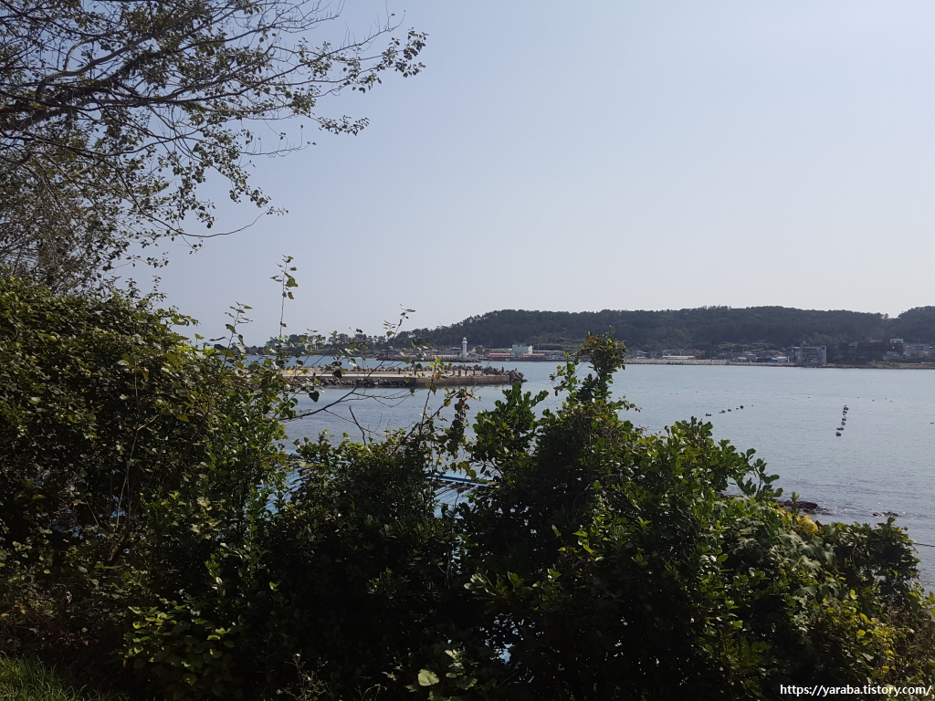 해안을 돌아서니 멀리 이동 방파제의 모습이 보인다. 여전히 맑은 하늘은 몸은 피곤하지만 걷기의 에너지가 된다.
