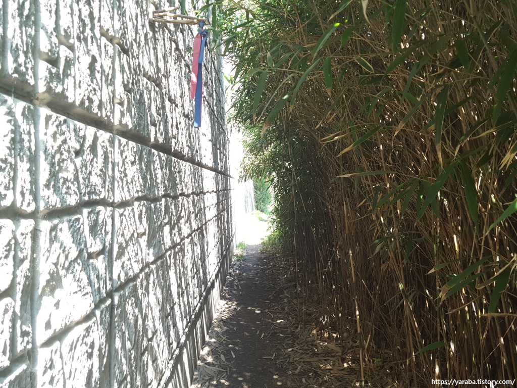 이렇게 높다란 담장 아래로 지나는 걷기 길은 전국에서 거의 이곳이 유일하지 않을까 싶다. 높다란 콘크리트 옹벽과 대나무 밭 사이가 독특한 터널을 만들어 놓았다. 몇 년 후의 이 길의 모습은 과연 어떨게 남을지......
