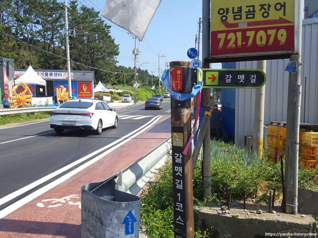 이동항부터는 해안길로 가지 못하고 삼기 물산이라는 회사 앞에서 좌회전하여 일광로 길을 따라 온정 마을까지 차로변을 걸어야 한다. 아무래도 바위 해안가와 카페 등의 사유지 때문이 아닐까 싶다.