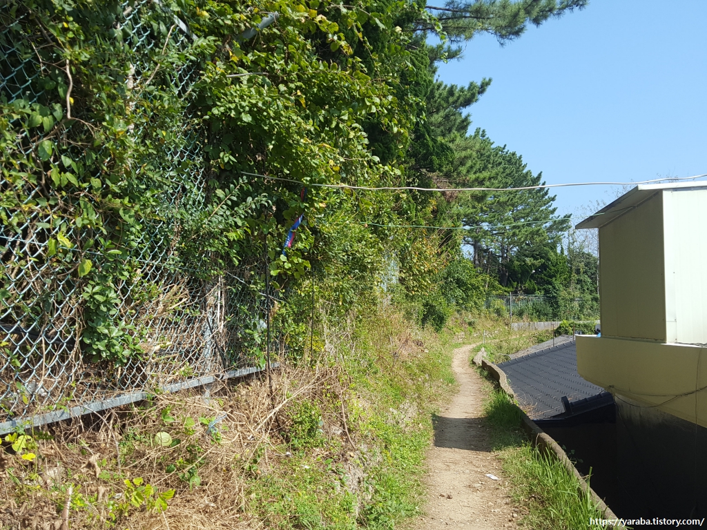 해파랑길은 이천 해녀 복지 회관 앞에 있는 정자 앞에 있는 좁은 샛길로 이어진다.
