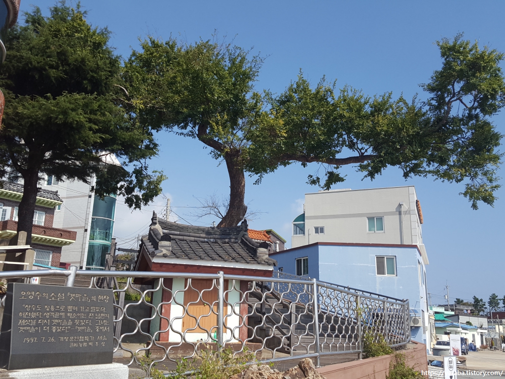 오영수의 단편소설 '갯마을'의 현장이라는 설명과 함께 소설의 일부를 새겨 놓았고 옛집을 하나 만들어 놓았고 바로 바다 쪽으로는 물고기 조형물을 세워 놓았다. "상수도 징용으로 뽑혀가고 말았다. 허전했다. 생각 끝에 해순이는 전 남편의 제삿날 다시 갯마을을 찾았다. 그녀는 갯마을이 더 좋았다" 고등이 잡이 나갔던 첫 남편이 돌아오지 않는 상황에서 주인공 해순을 겁탈했던 사람이 바로 두 번째 남편 상수인데 그 조차도 징용으로 끌려간 것이다. 기구한 해순의 삶에 밝은 빛으로 인도해 준 것이 바로 갯마을이라는 스토리. 조금 전 해수욕장에서 만난 해녀 복장의 해순상이 그려진다. 열아홉 나이에 시집을 간 해순을 상상해 보면 갯마을을 찾은 해순의 나이가 딸아이의 나이라는 것에 만감이 교차한다.