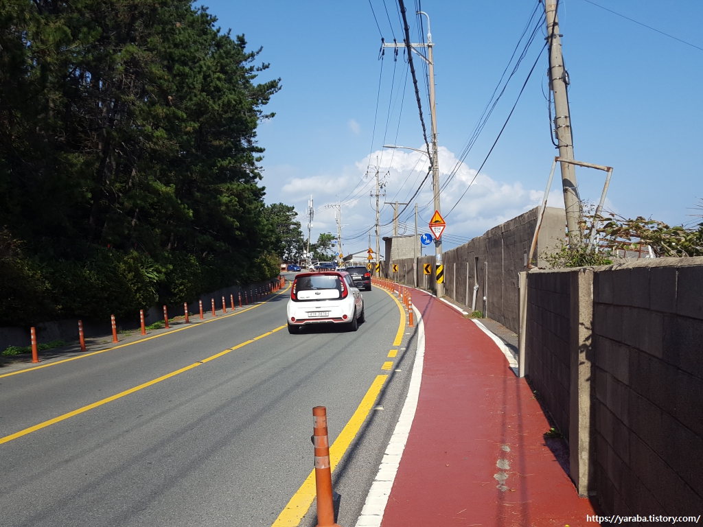 터벅터벅 일광로 차로변을 걷는다. 다행히 도보길이 구분되어 있어 안전에는 문제가 없었다. 자전거가 없어서 다행이지만 사람과 자전거가 같이 가는 자전거, 보행자 겸용 도로이다.