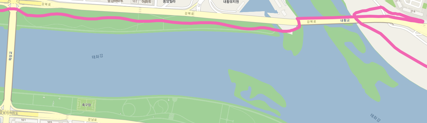 학성교 아래를 지나서 강변 산책길 끝에 이르면 태화강에 합류하는 동천으로 인해서 길이 다시 한번 끊어진다. 일단 강북로를 이어주는 내황교 아래를 지나서 내황교 위로 올라가 다리를 통해서 동천을 건넌다. 내황교 다리를 건너서 가드레일 끝에 이르면 바로 앞 아파트로 들어가는 입구와 함께 좌측으로는 강변으로 내려갈 수 산책로가 시작된다. 산책로를 내려와 내황교 아래로 길을 이어가면 된다.