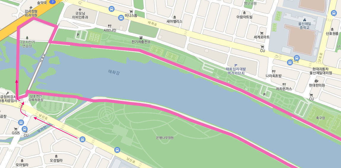 자전거 및 보행자 전용 다리를 건너면 심삼호교 아래에서 강변으로 내려간다. 강변로를 따라 걷다가 구 삼호교 아래에서 태화강변으로 나와서 길을 쭉 이어가면 된다.
