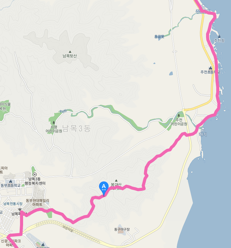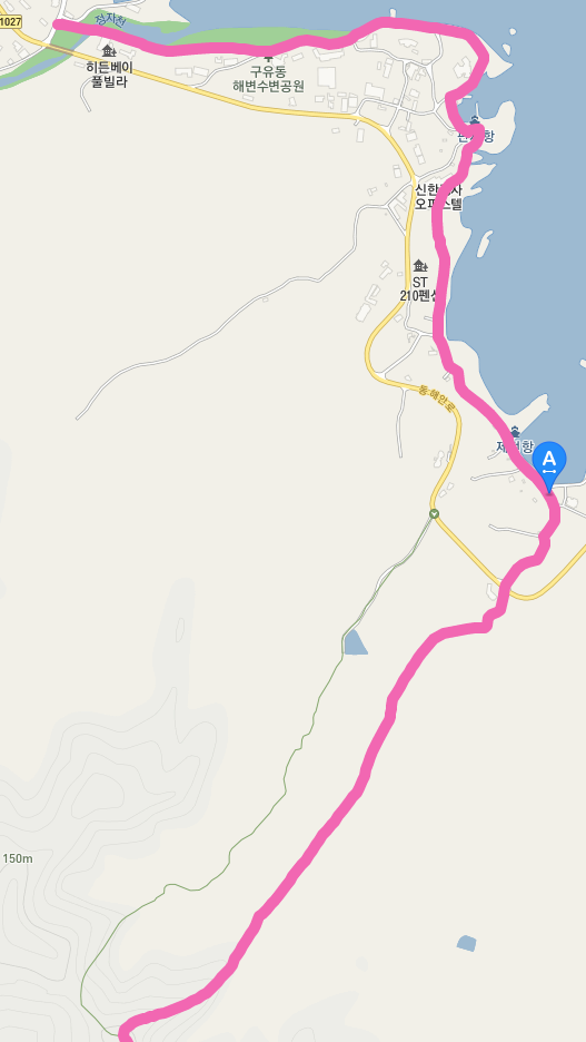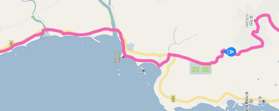 주전 해변을 지나면 당사항을 거쳐서 강동축구장에 도착한다. 축구장을 지나면 다시 우가항을 바라보는 우가산(173.2m)을 넘는다. 오늘의 마지막 고비이지 않을까 싶다.