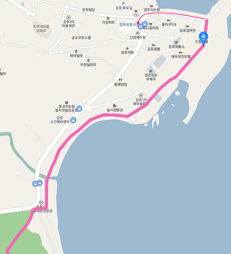 전촌항 뒷산을 넘어서서 해안길을 걸으면 감포항을 만날 수 있다. 감포항에 도착하면 바로 근처에 있는 "감포시장, 감포항" 정류장으로 이동하여 신경주 역을 통해 집으로 돌아간다. 감포 시장 부근에서 저녁 식사를 해결하고 힘이 남는다면 시장도 돌아보고 경주 황남빵도 맛보고 가면 좋을 듯하다.