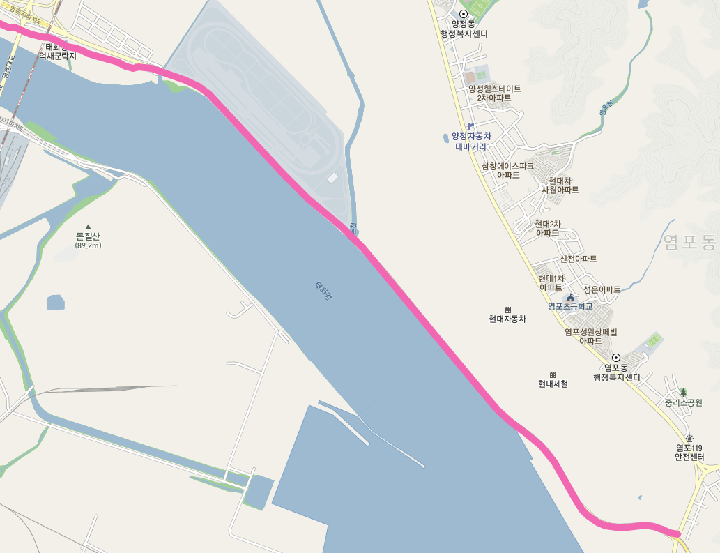 명촌대교를 지나면 태화강 억새 군락지를 만난다. 그야말로 장관일 것 같다. 억새 군락지를 지나면 아산로로 올라와서 현대자동차 그룹의 공장 옆의 도로변 길을 염포산 입구까지 걷는다.