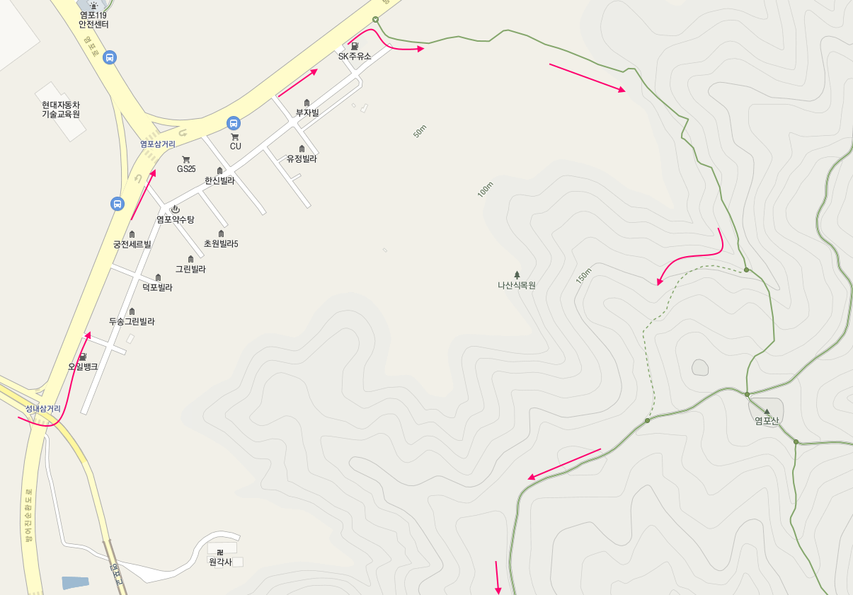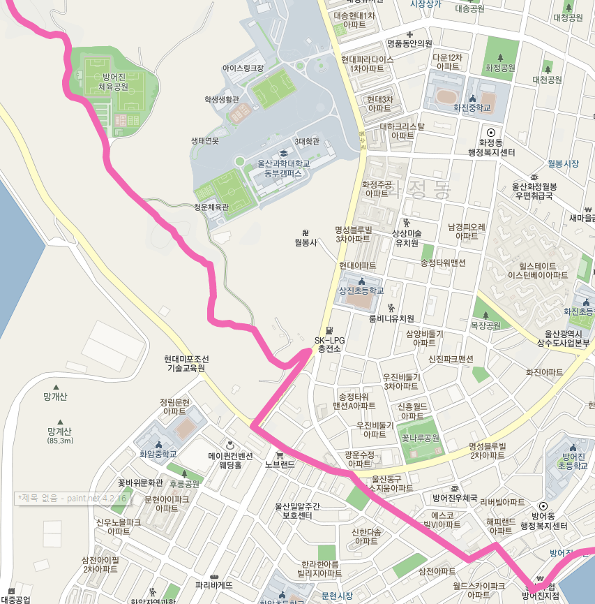 오늘은 조금은 무리가 될 수 있지만 7코스, 8코스를 이어서 걷는다. 오전 중에 염포산 입구에 도착할 수 있다면 무리 없이 8코스까지 끝낼 수 있을 것으로 보인다. 아산로 끝에서 길을 건너 좌회전하여 염포 삼거리 쪽으로 향한다. 염포 삼거리를 지나면 주유소를 만나는데 주유소 끝에 있는 등산로 입구에서 염포산 오르기를 시작한다. 염포산 정상(203m)까지 오르지는 않고 중간 갈림길에서 능선을 따라 방어진 방향으로 이동한다. 울산의 공업단지들을 조망할 수 있을 것으로 보인다.