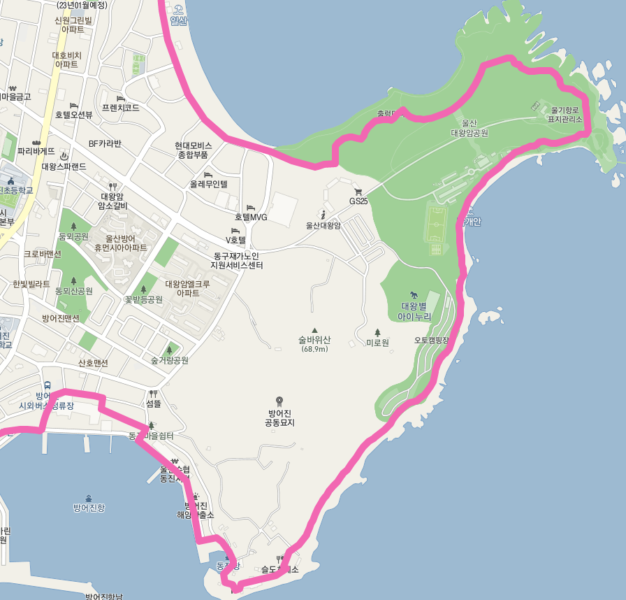 울산대교 전망대를 지나면 내리막길이 이어지므로 오늘 걷기의 고비는 지났다고 할 수 있다. 방어진 체육공원을 지나 방어진항에 이른다.
