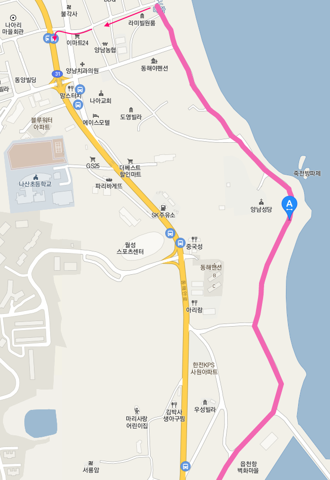 이후의 길은 31번 국도를 만나서 도로변을 걷다가 다시 해변으로 나갔다를 반복하며 위로 올라간다. 가곡항, 나정항 등을 만난다.