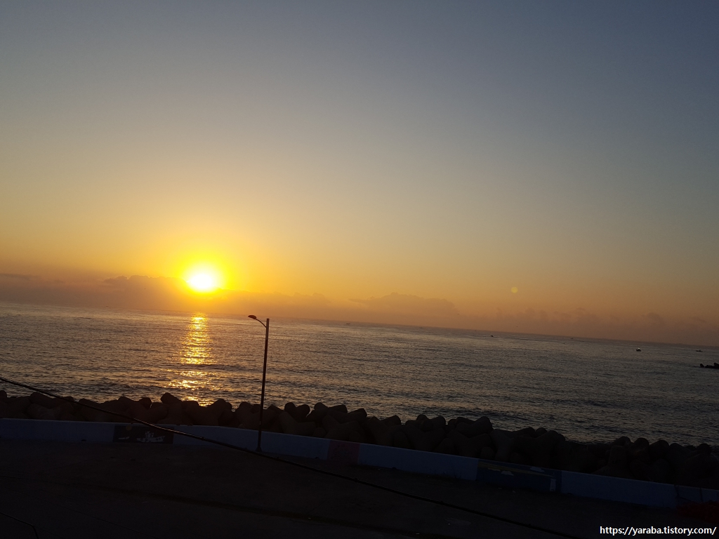 숙소에서 바라본 동해 일출의 모습이다. 조금 있으면 파란색과 남색만 남을 하늘색이 주황빛으로 물들었다. 무지개로 하늘의 색을 설명할 수 있는데 같은 하늘이지만 사람의 눈에 다른 색으로 보이는 것은 빛의 산란(레일리 산란 현상) 때문이다. 빨주노초파남보 색상 중에서 파장이 가장 짧은 보라색은 거의 사라진다. 낮에는 남색이나 파란색이 지상에 도달하여 푸른색 하늘이 보이는 것이고, 아침이나 저녁에는 태양이 사선에 위치하여 태양빛이 도달하는 길이가 길어짐에 따라 파장이 긴 빨간색이나 주황색으로 보이는 것이다. 물론 별빛도 없는 칠흑 같은 밤에는 검은색이고, 중천에 뜬 태양 빛은 흰색이다.