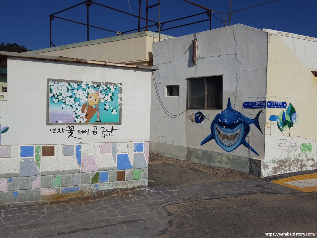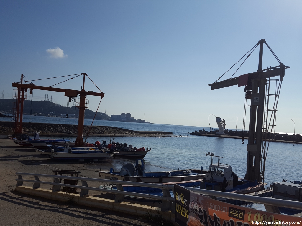 임랑리 포구 뒤로는 원자력 발전소가 더 가까이 보이고 포구 입구에는 물고기 모양의 물고기 등대가 있다. 낚시에 걸린 물고기 모양이다.