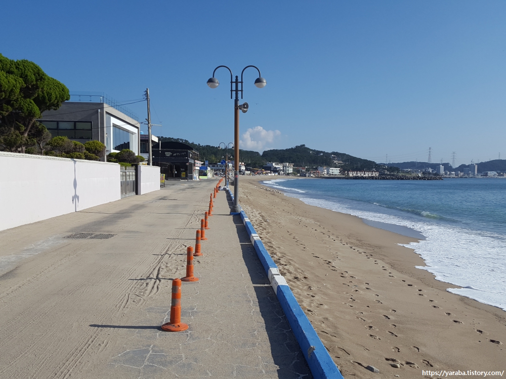 해변로를 따라 길을 이어간다. 모래사장에 누군가 남겨놓은 발자국이 쓸쓸함을 느끼게 한다.