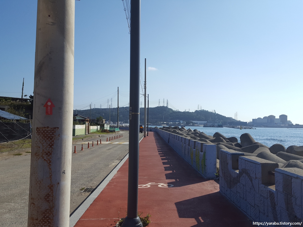 이전의 해파랑길은 월내항에서 좌회전하여 월내역을 거쳐서 월내를 벗어났지만, 지금은 월내항 방향으로 직진하여 장안천을 만나서 장안천을 따라 올라가는 방법으로 걷는다. 항구의 위치를 잡아주는 빨간 등대, 하얀 등대 뒤로 보이는 원자력 발전소의 모습도 몇발자국 걸으면 이제 안녕이다. 과학자들이 원자력 발전의 안전과 폐기물 처리에 대한 효과적인 방안 마련에 획기적인 전기를 찾을 수 있으면 어떨까 하는 생각을 해본다. 탄소 배출 문제가 심각한 상황에서 정치적 해결이 아니라 모두가 공감하는 과학적 해결 방안이 나올수 있다면 좋지 않을까 하는 생각을 해본다.